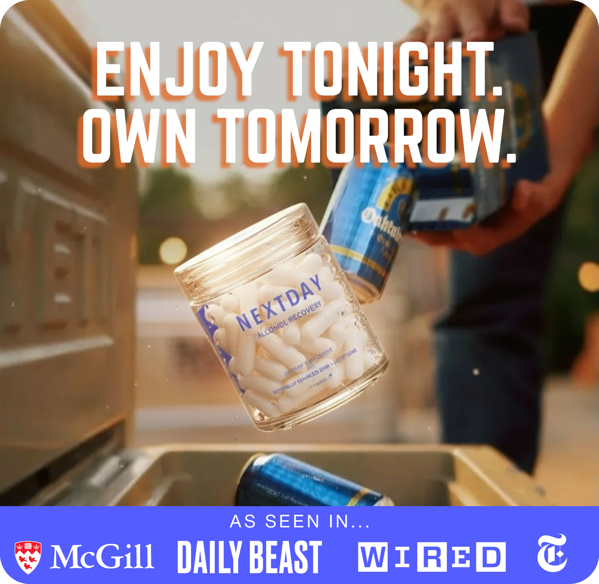 At NextDay, we are so confident in our product that you get 60 days to try it. If you don't feel at least 50% better the morning after, your order will be on us.